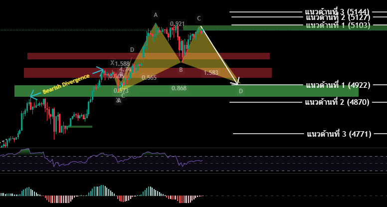 H4/H1 H4 ราคาดีดขึ้นสร้าง ATH ในระดับ 5111 ซึ่งตรงกับ Fibo Ret 261.8 ซึ่งครบรอบการเคลื่อนที่ึ้นประกอบกับ มีสัญญาณ Bearish divergence H4 มีโอกาสปรับตัวร่วงลง H1 มีการสร้าง Hamonic H1