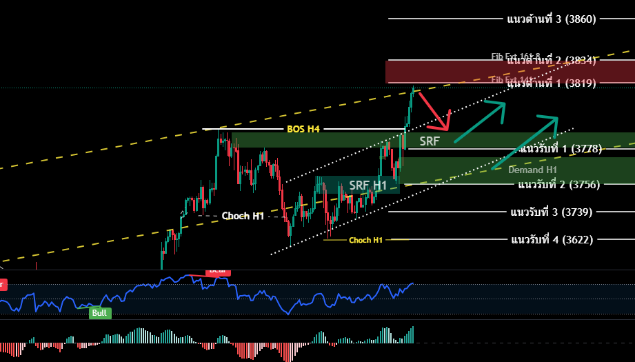 DAY ศุกร์ที่ผ่านมา ทองคำ ปิดบวก $10 ราคาสามารถ เบรคจุด Choch H1 ที่ระดับ $3761 ซึ่งเป็นจุดสิ้นสุดโครงสร้างเทรนด์ขาลงระยะสั้น ทองคำได้รับแรงหนุน ประกาศตัวเลข Core PCE Price index ดัชนีราคาการใช้จ่ายบริโภคส่วนบุคคล 0.2% และ Headline PCE รวมหมาดอาหารและพลังงานปรับขึ้น 2.7% (ตามเป้าหมายนักเวิเคราะห์) สะท้อนเงินเฟ้ออยู่ในระดับที่ควบคุมได้ มีโอกาสที่ปรับลดดอกเบี้ย ในขณะที่เวลาถัดมา มิเชล โบว์แมน รองประธานเฟด กลับลำ แถลงย้ำ เฟด ต้องดำเนินการเด็ดขาดในเชิงรุก เพื่อรับมือกับความออนแอของตลาดแรงงานมากกว่าจะมาเน้นเรื่องตัวเลขเงินเฟ้อ เป็นปัจจัยกดดันต่อการอ่อ่นค่า USD(DXY) ปัจจัยบวกต่อทองคำ กลับมาบริเวณ $3783.55 ซึ่งอยู่ในบริเวณ แนวต้าน Supply H4 กรอบ 3775-3789 ก่อนจะปรับตัวย่อลงบริเวณแนวรับ SRF (แนว Choch เดิม) ที่กรอบ 3761-3755 ก่อนจะดีดขึ้นในเช้านี้ ทั้งปัจจัยบวกในช่วงสุดสัปดาห์ ในเรื่องการกลับมาโจมตียูเครนของรัสเซีย และ ยังความกังวลในเรื่องสงครามการค้า อาจกลับมา หลังสหรัฐมีการปรับ ภาษีนำเข้ายา 100% รถบรรทุกหนัก 25% :ซึ่งประเทศที่เคยได้รับภาษีนำเข้า 10-15 % อยางอังกฤษ เกาหลี ญุ่ปน EU อาจต้องพิจารณาใหม่ในเรื่องนี้ด้วย