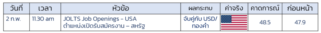 • คาดว่าตำแหน่งรับสมัครงาน สูงกว่าเดือน พ.ย. หาตัวเลข มากกว่าคาดการณ์ เช่น มากกว่า 50 จึงจะมีผลต่อเศรษฐกิจ USA ขยายตัว กดดันราคาทองคำ แต่หากตัวเลขน้อยกว่า 30 จะเป็นปัจัยบวกต่อทองคำ