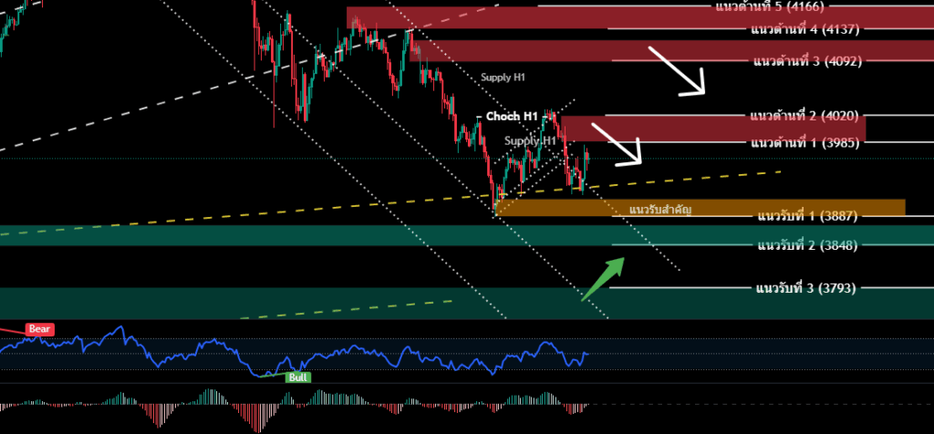 H4/H1 ราคาทองคำยังคงเป็นการเคลื่อนที่ในเทรนด์ขาลง วานนี้ราคาทองคำขึ้นมาทดสอบจุด Choch H1 ที่ 4020 แต่ยังไม่สามารถยืนขึ้นได้ ราคาปรับตัวร่วงลงในช่วง พาวเวล แถลง แรงขายยังคงมีมาต่อเนื่องในช่วงเช้าวันนี้ จากการเจรจาการค้าระหว่าง ทรัมป์ – สิจิ้งผิง แม้ยังไม่ข้อสรุปการเจรจา แต่จากการให้สัมภาษณ์ทรัมป ออกมาในทิศทางที่ดี เป็นปัจจัยกดดันราคาทองคำ ทั้งนี้หากราคาทองคำไม่สามารถยืนเหนือ 3910-3887 ได้ มีโอกาสที่จะปรับตัวร่วงลงแรงเช่นกัน