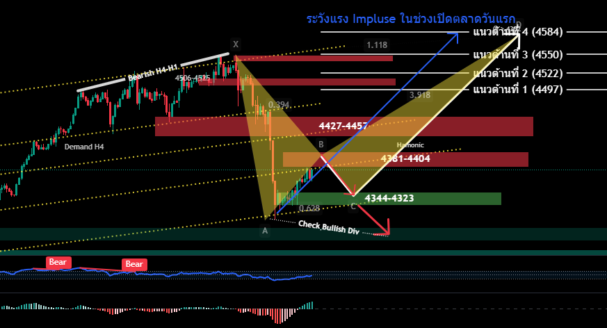 H4/H1 วานนี้มีแรงเทขายทำกำไร จากสัญญาณ Bearish Divergence H4 ในโซน Overbought ทั้ง H4-H1 แรงขายต่อเนื่องวานนี้ลักษณะ FOMO / ภาพรวม H4 เป็นการปรับตัวย่อลงในระดับ 4302 ตรงกับ Fibo 88.6 Retracement มีโอกาสที่จะกลับขึ้นไปทดสอบ 4584 แต่ราคาต้องไม่ลงตำกว่า 4302 (H4 ย่อปรับฐานจบแล้ว) ทั้งนี้อาจเห็นรูปแบบการการเคลื่อนไหวแบบ Harmonic หากราคา ยืนเหนือกรอบ 4344-4323 / แต่หากการย่อในระดับ H4 ยังไม่จบ ราคาจะมีการสร้าง Low ใหม่ ต่ำกว่า 4302 ให้สังเกตสัญญาณ Bullish Divergence ก่อนเสี่ยงซื้อ