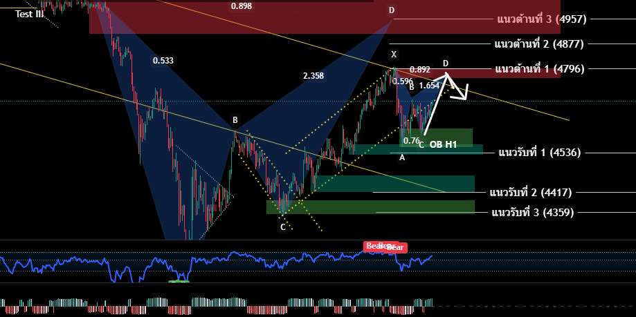H4/H1 ยังคงเป็นโครงสร้างเทรนด์ขาลง ราคากลับเข้ามาเคลื่อนไหว ใน Channel Downtrend H4 อีกรอบ หลังจากร่วงออกจากกรอบไป ต้งแต่วันที่ 19 มี.ค. มีการสร้าง Hamonic Bat ใน TF M30