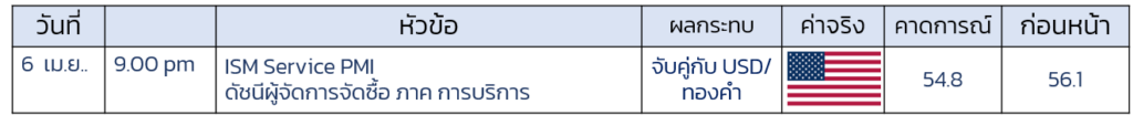 - ติดตามตัวเลข PMI – Service หากออกมากกว่า 56.1 สะท้อนเศรษฐกิจภาคบริการสหรัฐยังคงแข็งแกร่งและเป็นปัจจัยบวกต่อ USD กดดันทองคำ แต่หาก ออกมาน้อยกว่าคาดการณ์ หรือใกล้เคียง 50 จะยิ่งจะกดดัน USD ปัจจัยบวกต่อ ทองคำ