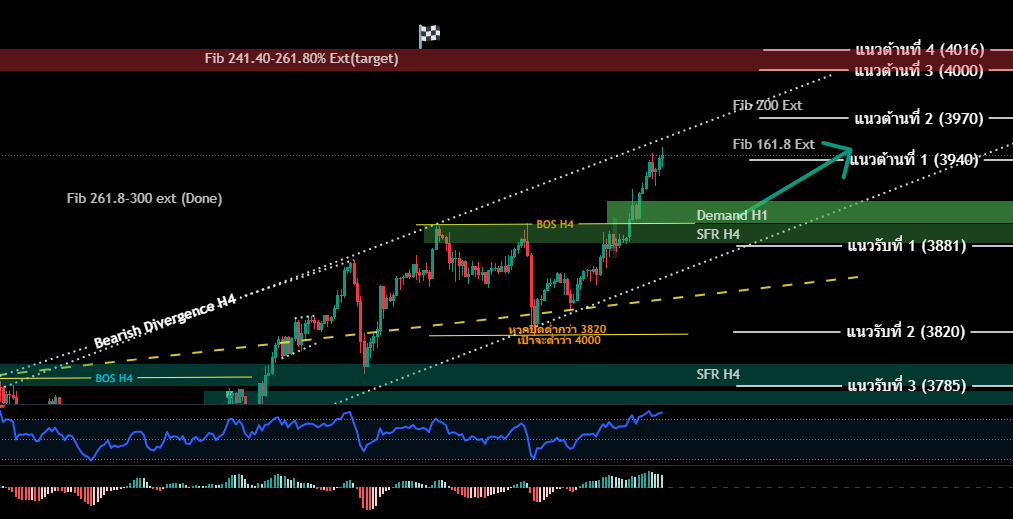 DAY.. ศุกร์ที่ผ่านมา ราคาทองคำปิดบวก$30 เช้านี้ยังคงมีแรงพุ่งขึ้นอย่างต่อเนื่อง เข้าสู่กรอบ Target $3940 Ext 161.8 ปัจจัยบวกมากจาก การที่สหรัฐ ยังคงปิด Government Shutdown อย่างต่อเนื่อง หลังศุกร์ที่ผ่านมา วุฒิสภา ตีตก ร่างฉบับชั่วคราว (ร่างยืดอายุ Shutdown) :ซึ่งส่งผลทำให้ เดโมแครต ต้องนำร่างกลับมาแก้ไขใหม่ นอกจากนี้ในช่วงศุกร์ที่ผ่านมา ถ้อยแถลงสายเหยี่ยว อย่าง สติฟเฟน มิแรน เรียกร้องให้เฟด ปรับลดอัตราดอกเบี้ย อย่างเร็วและแรงขึ้น เป็น 0.5% ในการประชุมคร้งหน้า เพิ่มโอกาส .ใน Fed Watch Tool ปรับลดดอกเบี้ย 0.25% ในเดือน ต.ค. ถึง 97% และ 0.25% ในเดือน ธ.ค. ถึง 85% ส่งผลให้ USD ปรับตัวร่วงลงซึ่งเป็นปัจจัยบวกต่อทองคำในวันศุกร์ เช้านี้ราคาทองคำพุ่งขึ้นสูงหลังจาก สถานะการณ์รัสเซีย-ยูเครน กลับมา ทวีความรุนแรงขึ้น ตามที่ปูตินยืนยัน และขู่ตอบโต้ ทั้งนาโน และสหรัฐ ในช่วงสุดสัปดาห์ที่ผ่านมา ทั้งทองคำ และ USD ในฐานะ Save Haven พุ่งขึ้นอีกครั้ง