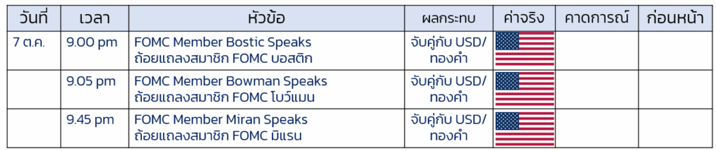 - ติดตามถ้อยแถลง บอสติก, โบว์แมน และ มิแรน สมาชิก FOMC ซึ่งจะให้ความคิดเห็นต่อโอกาสในการปรับลด หรือคง ดอกเบี้ยในการประชุมครั้งหน้า (มีผลต่อ USD และสินทรัพย์จับคู่)