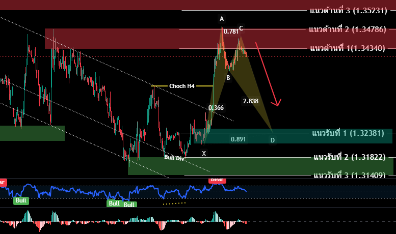 H4/H1 สิ้นสุดโครงสร้างเทรนด์ขาลงระยะสั้น GBP ยืนเหนือ CHoch H4 @1.33474 เข้าสู่แนวต้านสำคัญ ราคาเริ่มเข้าสู่ Overbought zone ระวังแรงขายทำกำไร เน้นการย่อซื้อจึงจะปลอดภัยกว่า